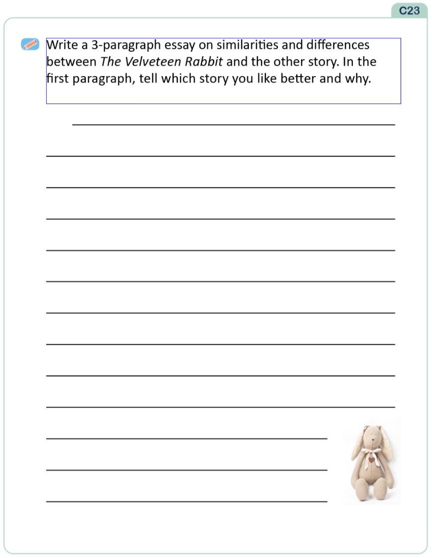 - Writing Students write paragraphs, short essays, poetry, and stories. Writing topic is often related to the theme in the text.